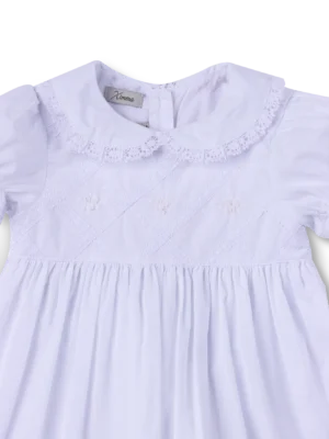 VESTIDO BEBÊ PREGAS GOLA BORDADA LISTRADO AZUL