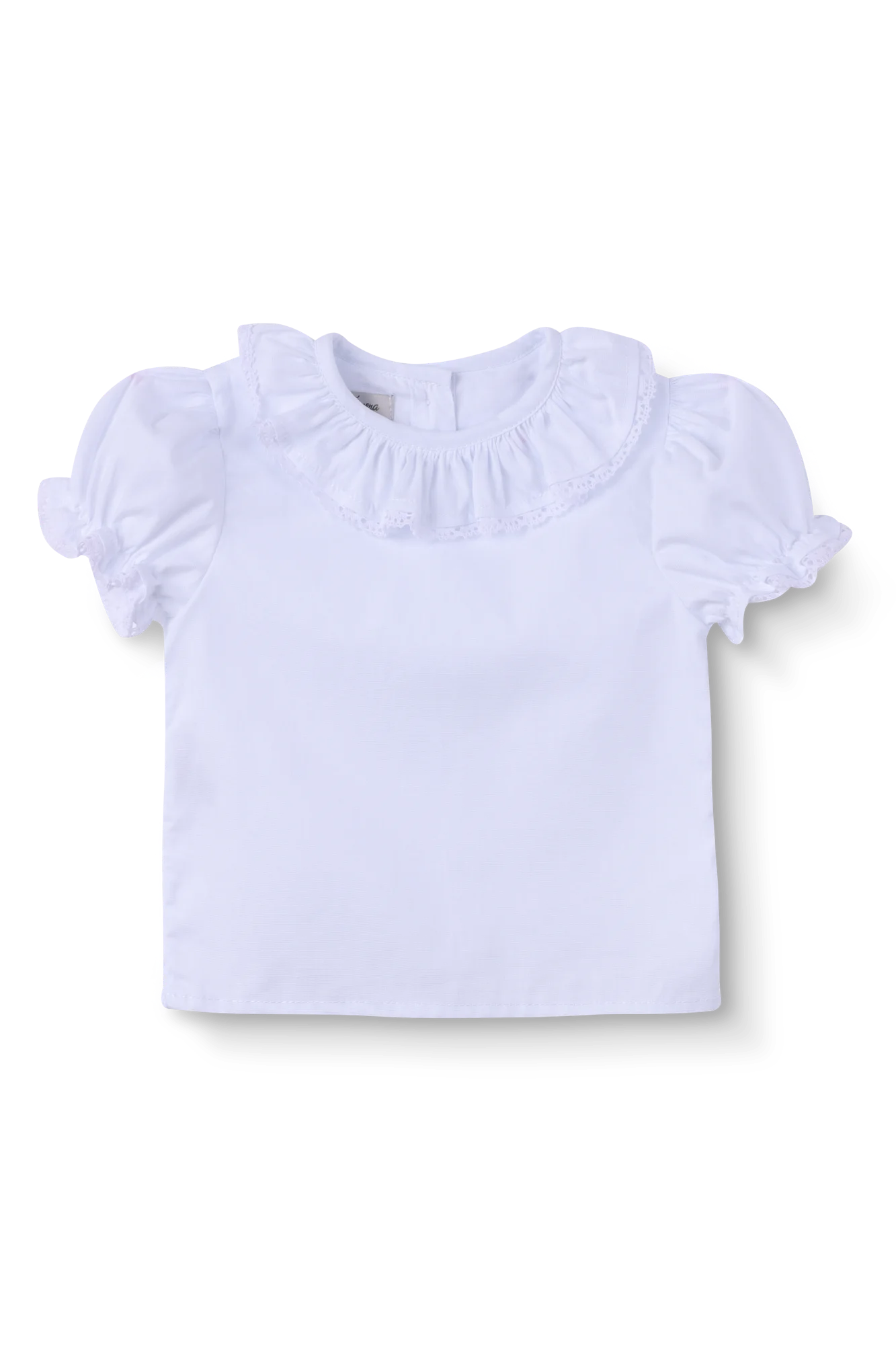 Camisa em tecido 100% algodão, gola de babado com renda aplicada, mangas bufantes e fechamento por botões.