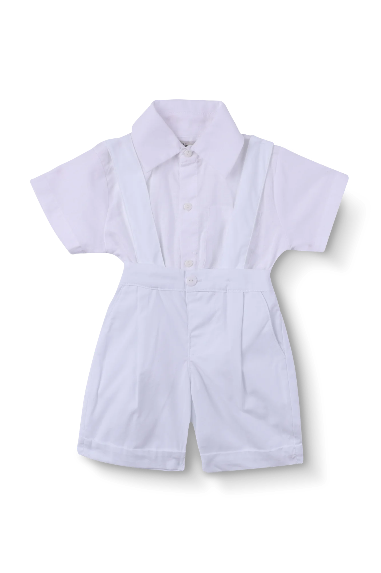 Conjunto em tecido 100% algodão, camisa branca de botões e bermuda branca com suspensório no mesmo tecido.