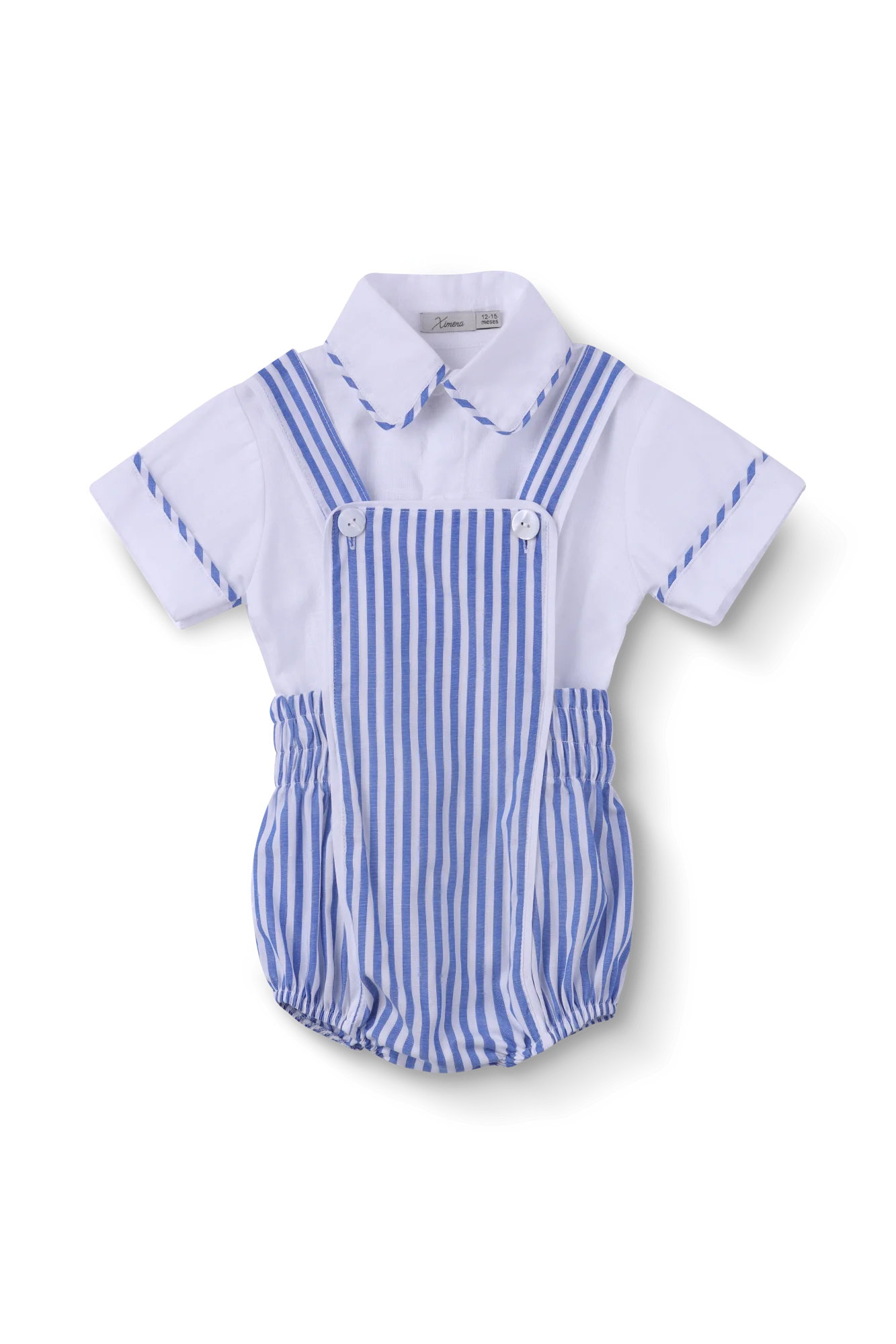 Jardineira em tecido 100% algodão listrado, camisa branca com detalhes no mesmo tecido e fechamento por botões.