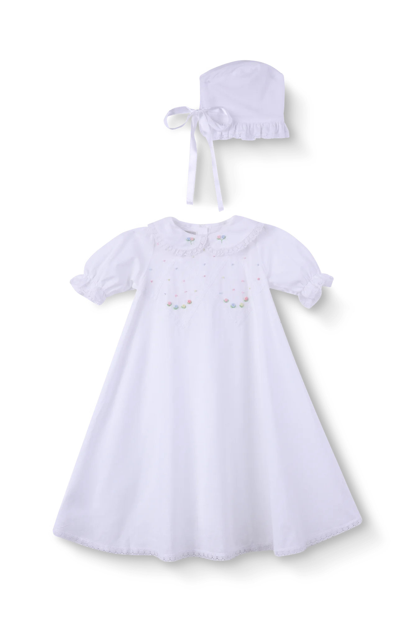Mandrião em tecido 100% algodão, com bordados à mão em tons pastéis, rendas aplicadas e fechamento por botões. Acompanha touca.