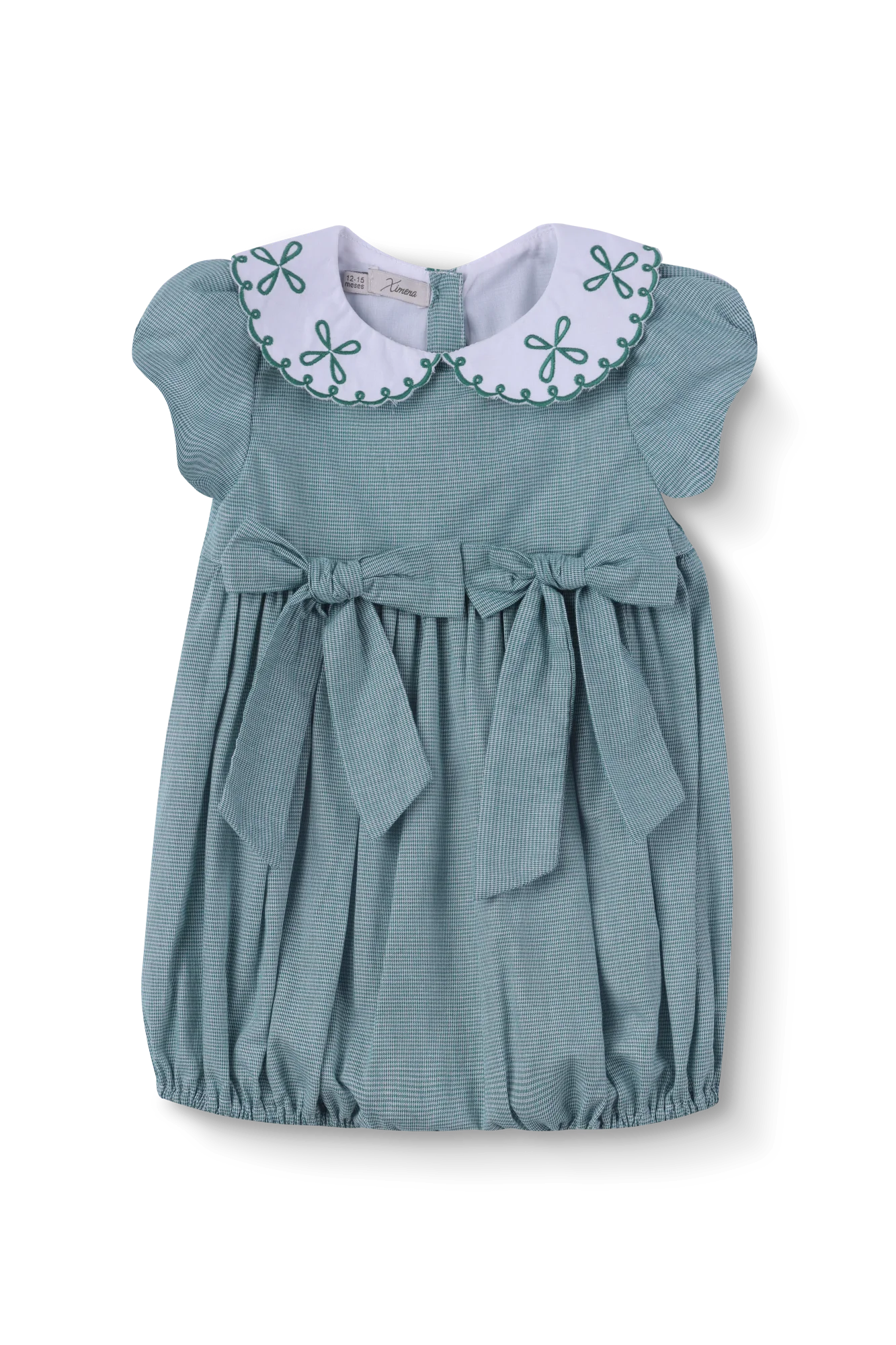 Pimpão em tecido 100% algodão xadrez de padronagem muito reduzida, gola branca bordada com flores e contorno em verde, laços no mesmo tecido, mangas tradicionais e fechamento por botões.