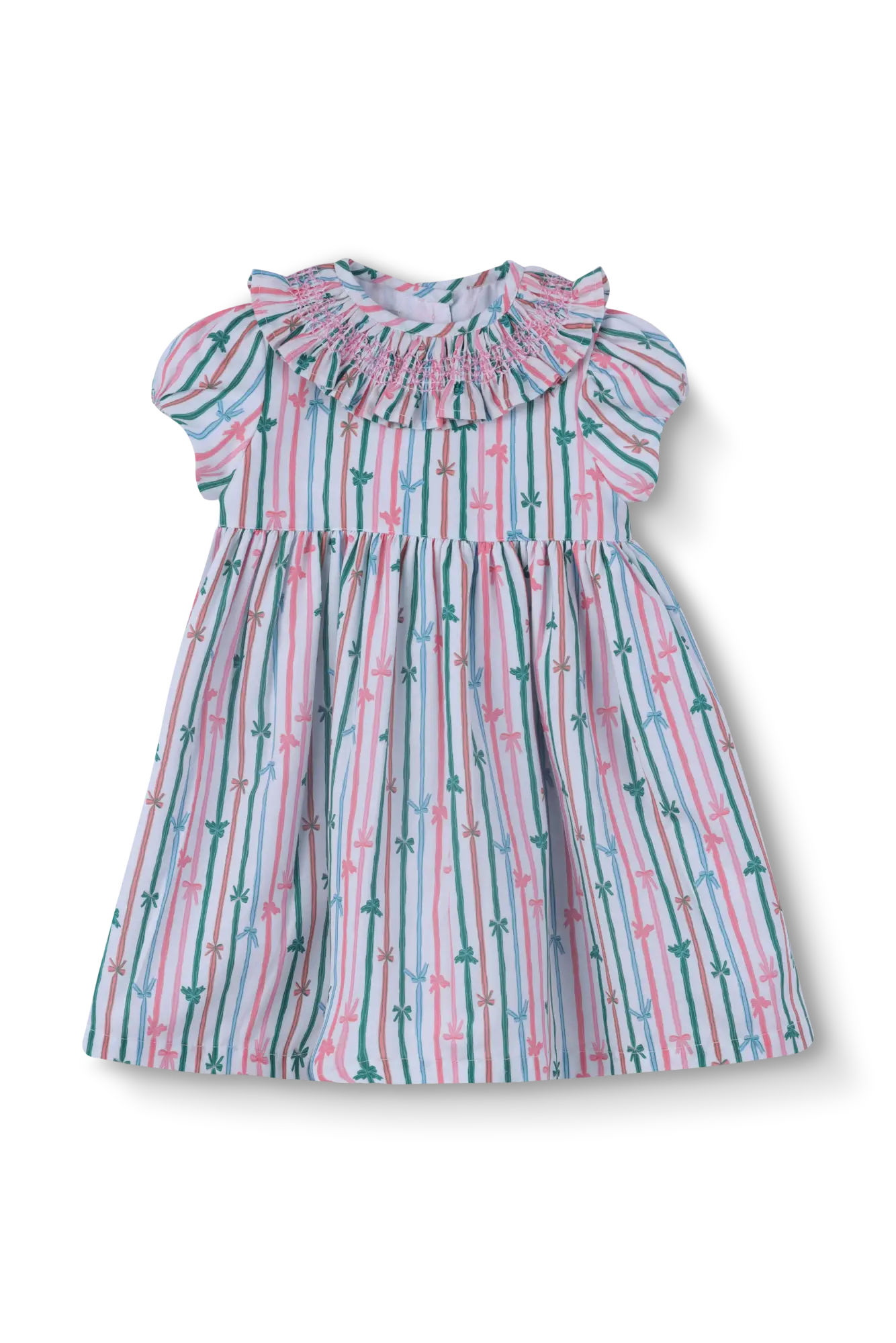 Vestido em tecido 100% algodão estapado, gola babado em ponto smock, mangas curtas tradicionais, fechamento em botões e laço para acinturar. Possui forro.