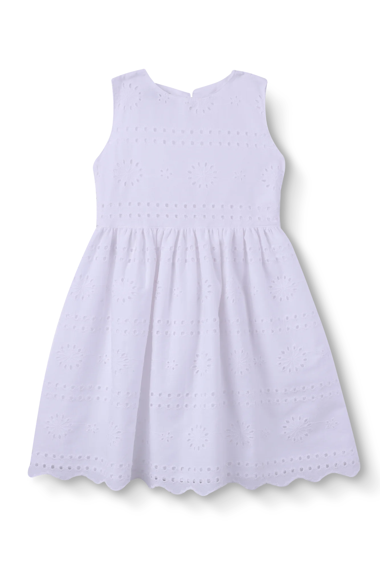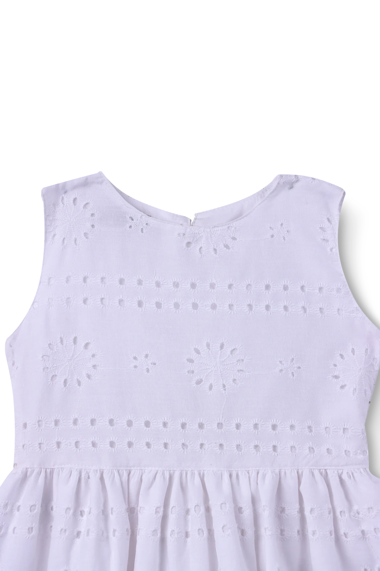 Vestido em laise 100% algodão, costas abertas, fechamento com botão de perola e laço para acinturar. Possui forro.