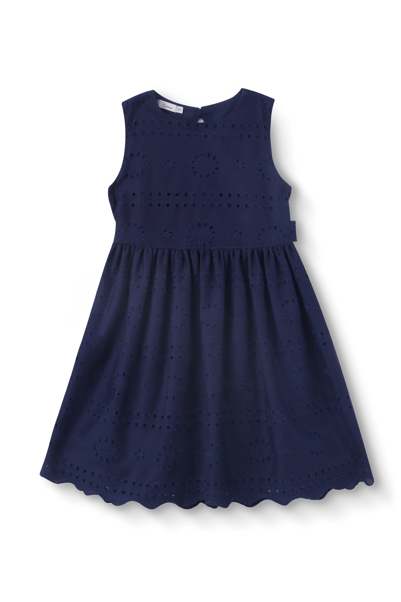 Vestido em laise 100% algodão, costas abertas, fechamento com botão de perola e laço para acinturar. Possui forro.