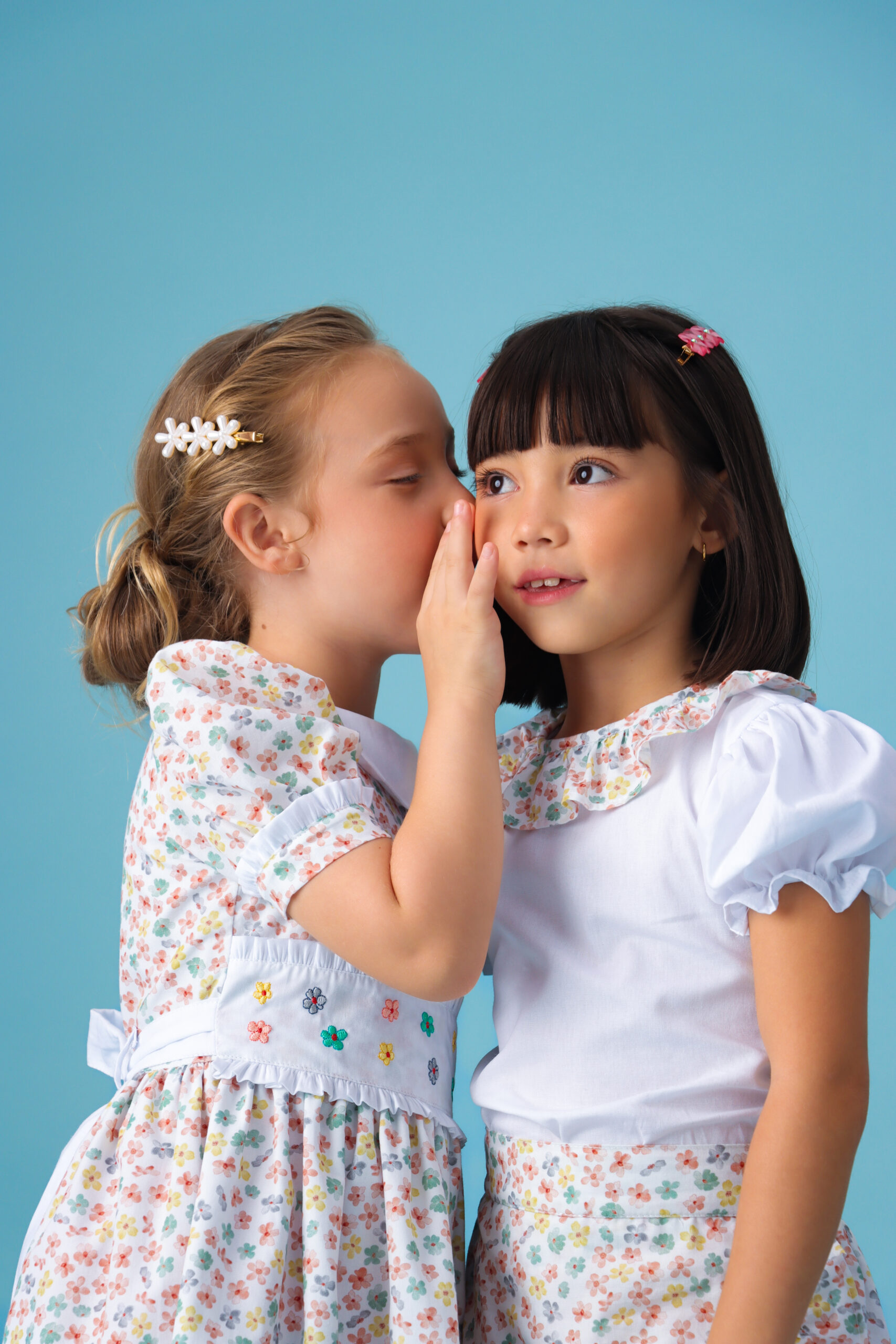 Vestido em tecido 100% algodão estampado, gola de babado branca, pala com flores bordadas iguais a estampa, mangas com detalhes de babadinhos brancos, fechamento por botões e laço para acinturar. Possui forro.